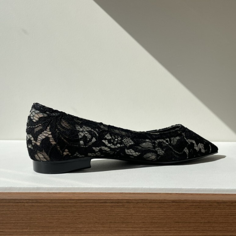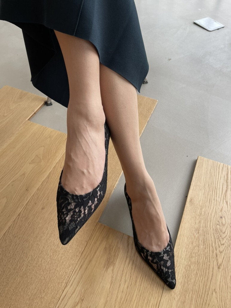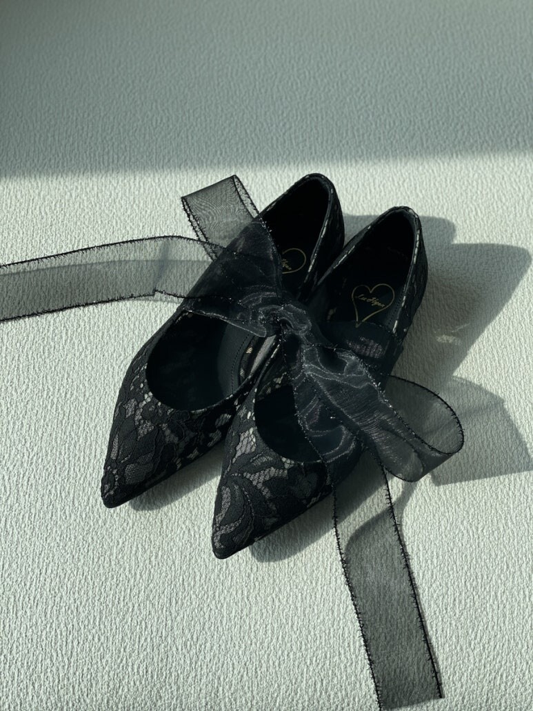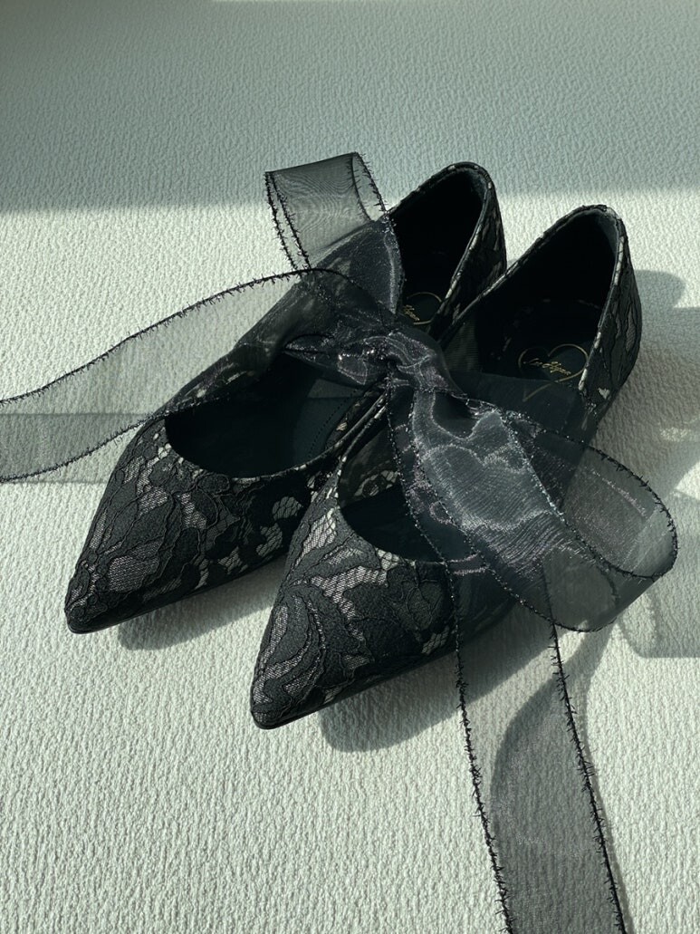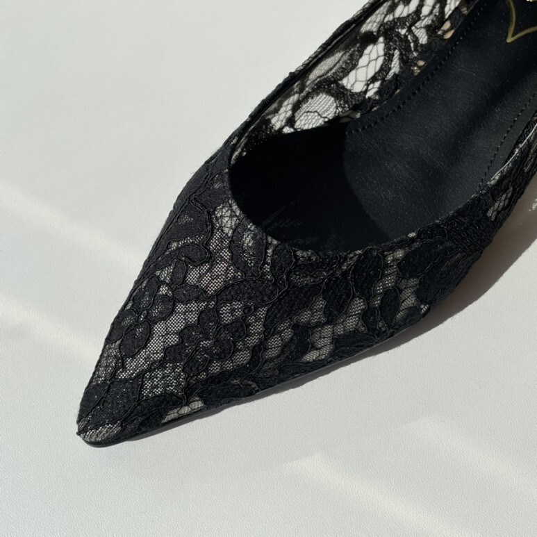 얇고 섬세한 블랙 레이스가 발등을 부드럽게 덮고