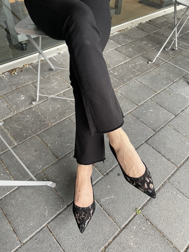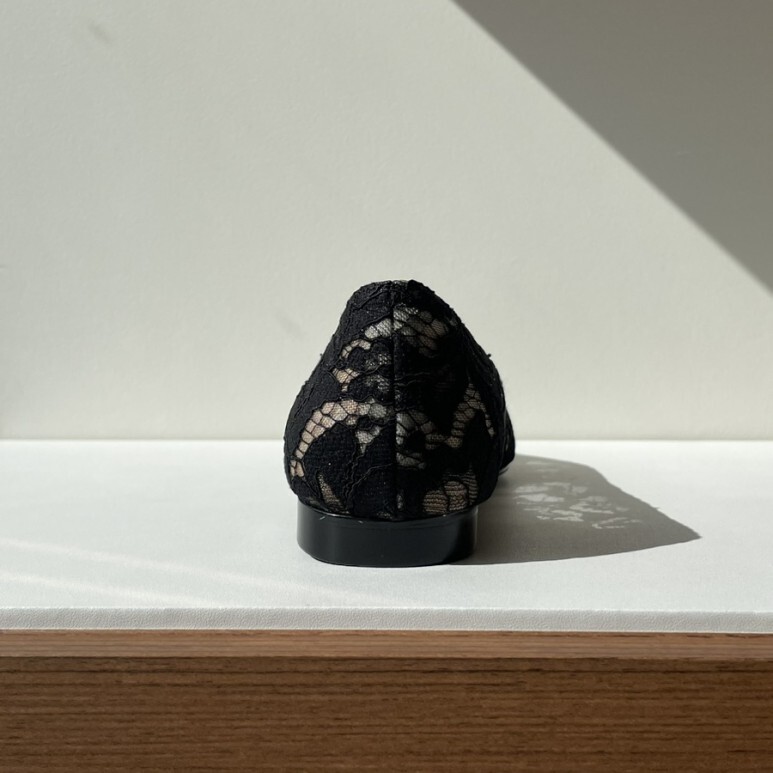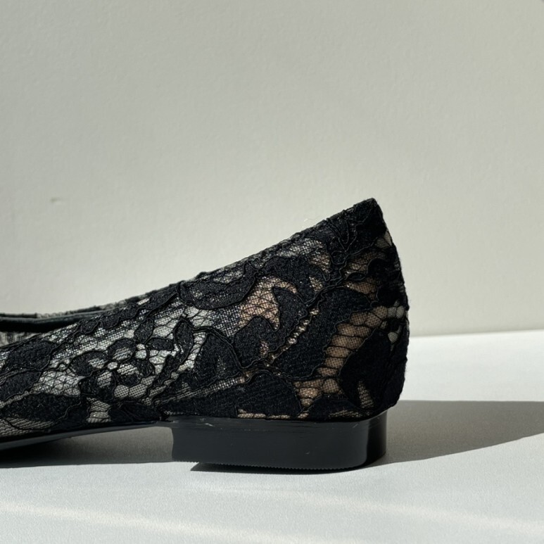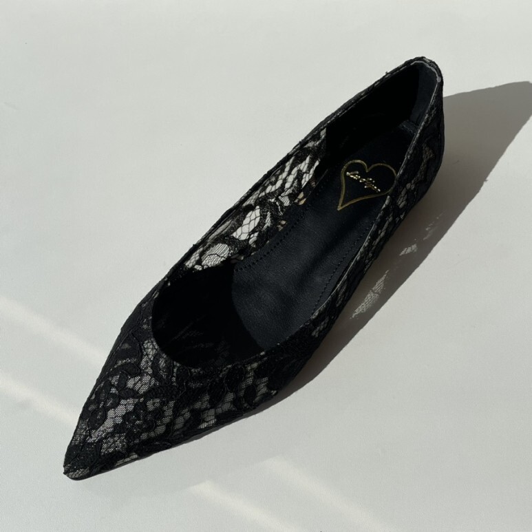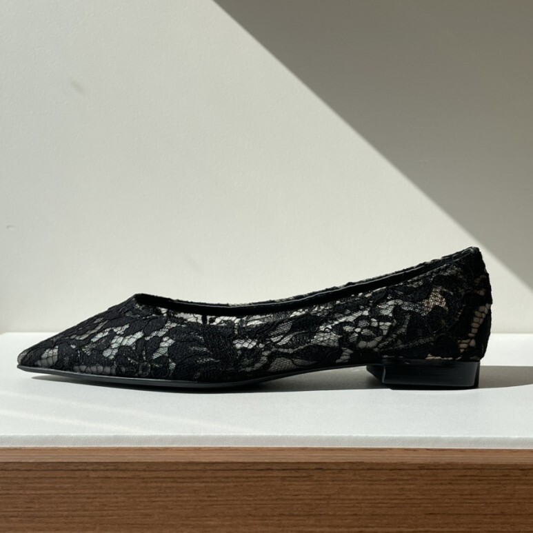 얇고 섬세한 블랙 레이스가 발등을 부드럽게 덮고