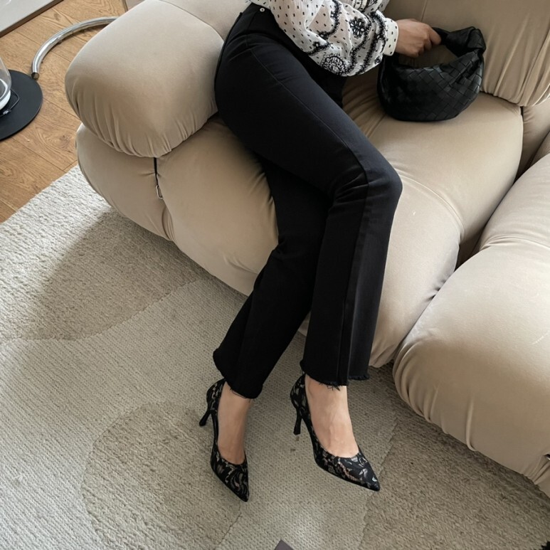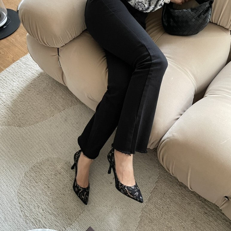 얇고 섬세한 블랙 레이스가 발등을 부드럽게 덮고