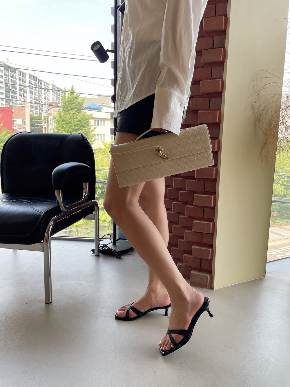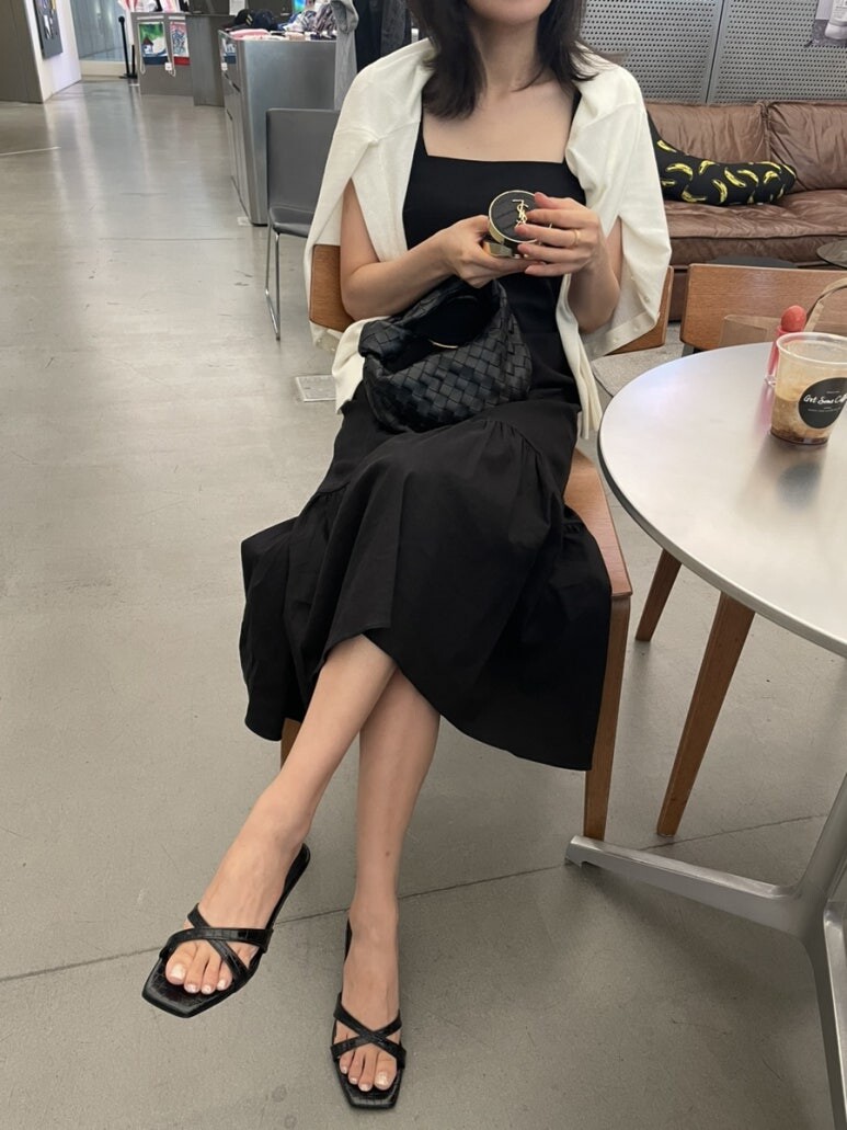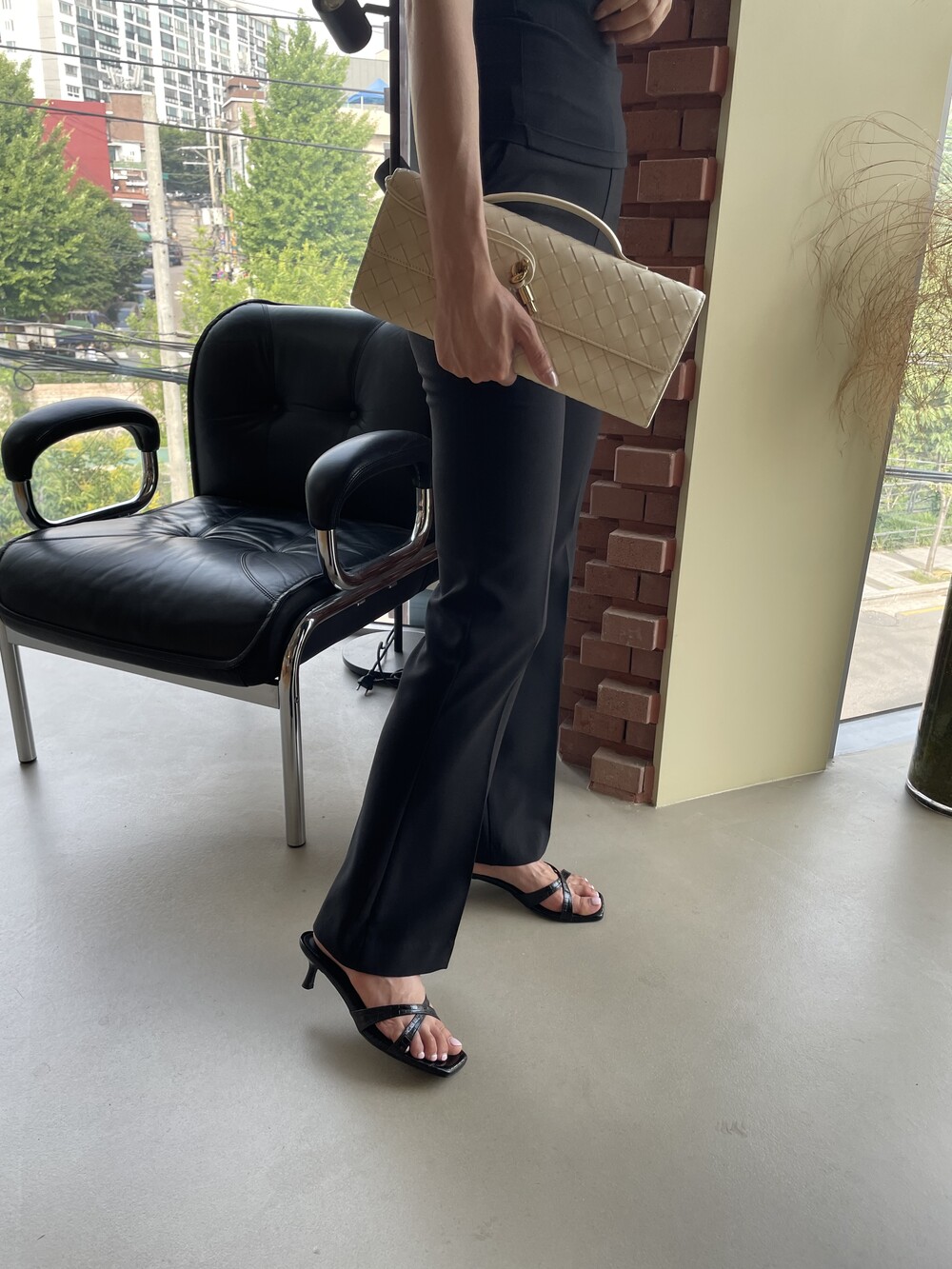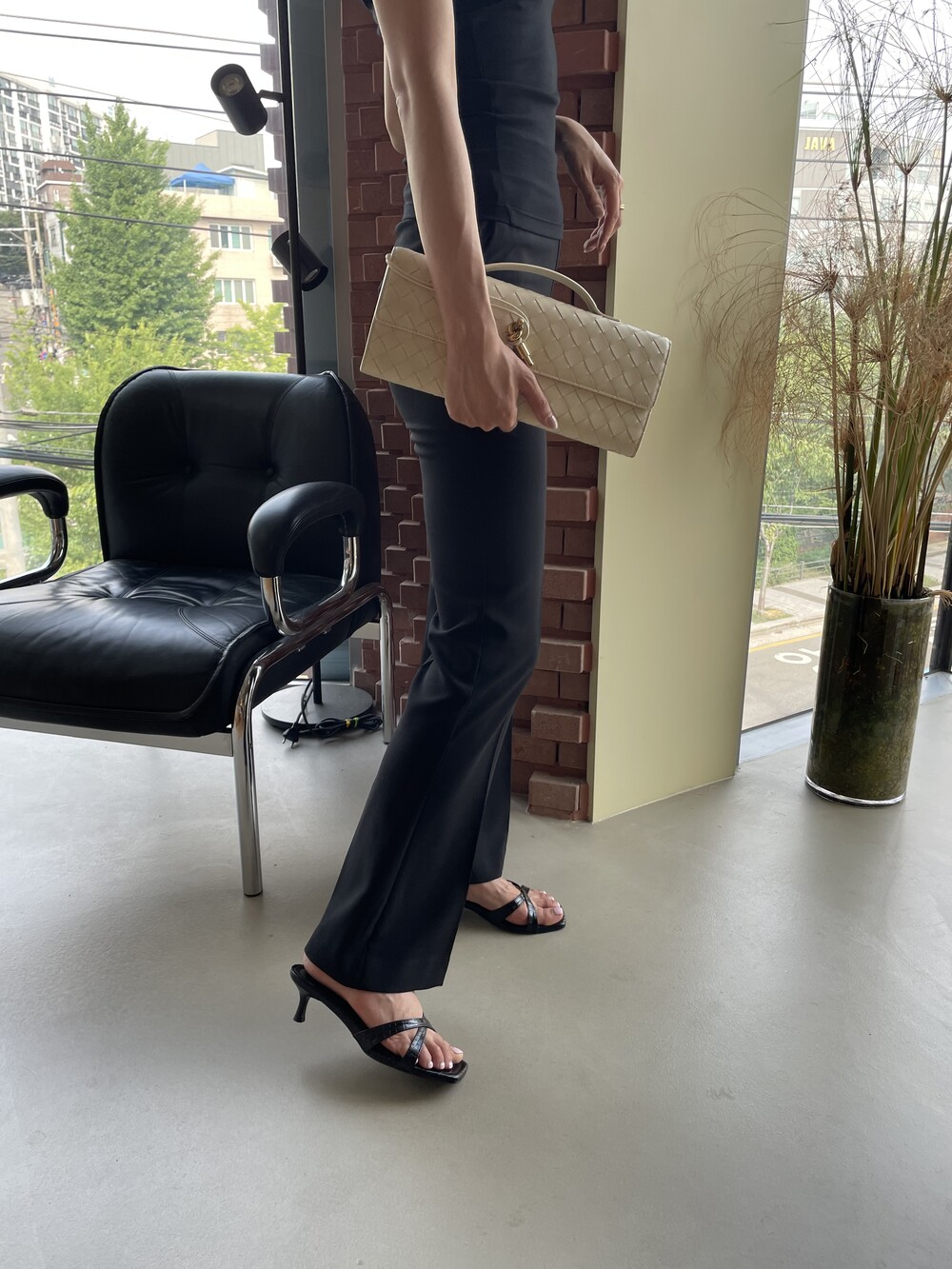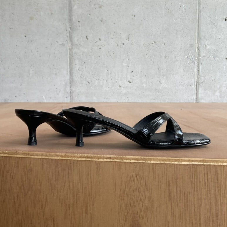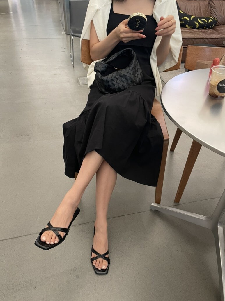 낮은 굽임에도 룩에 시크한 포인트를 주는 샌들로