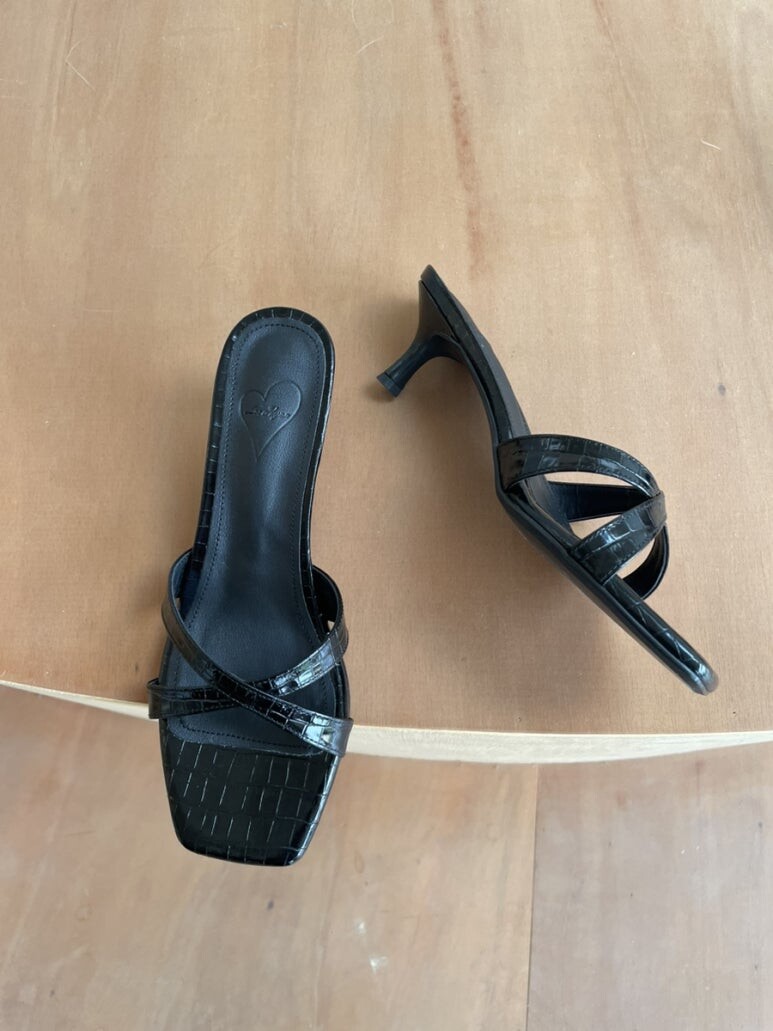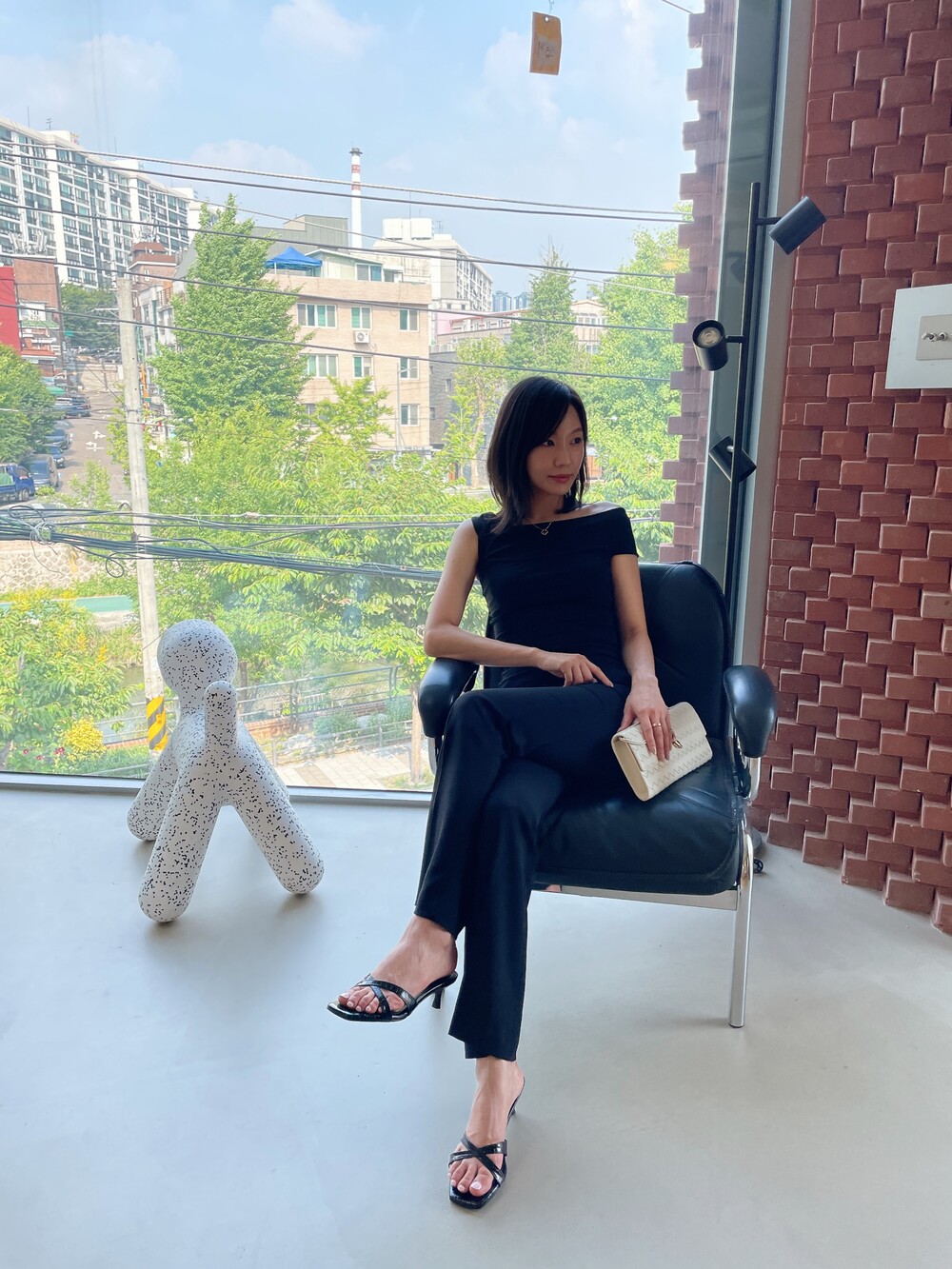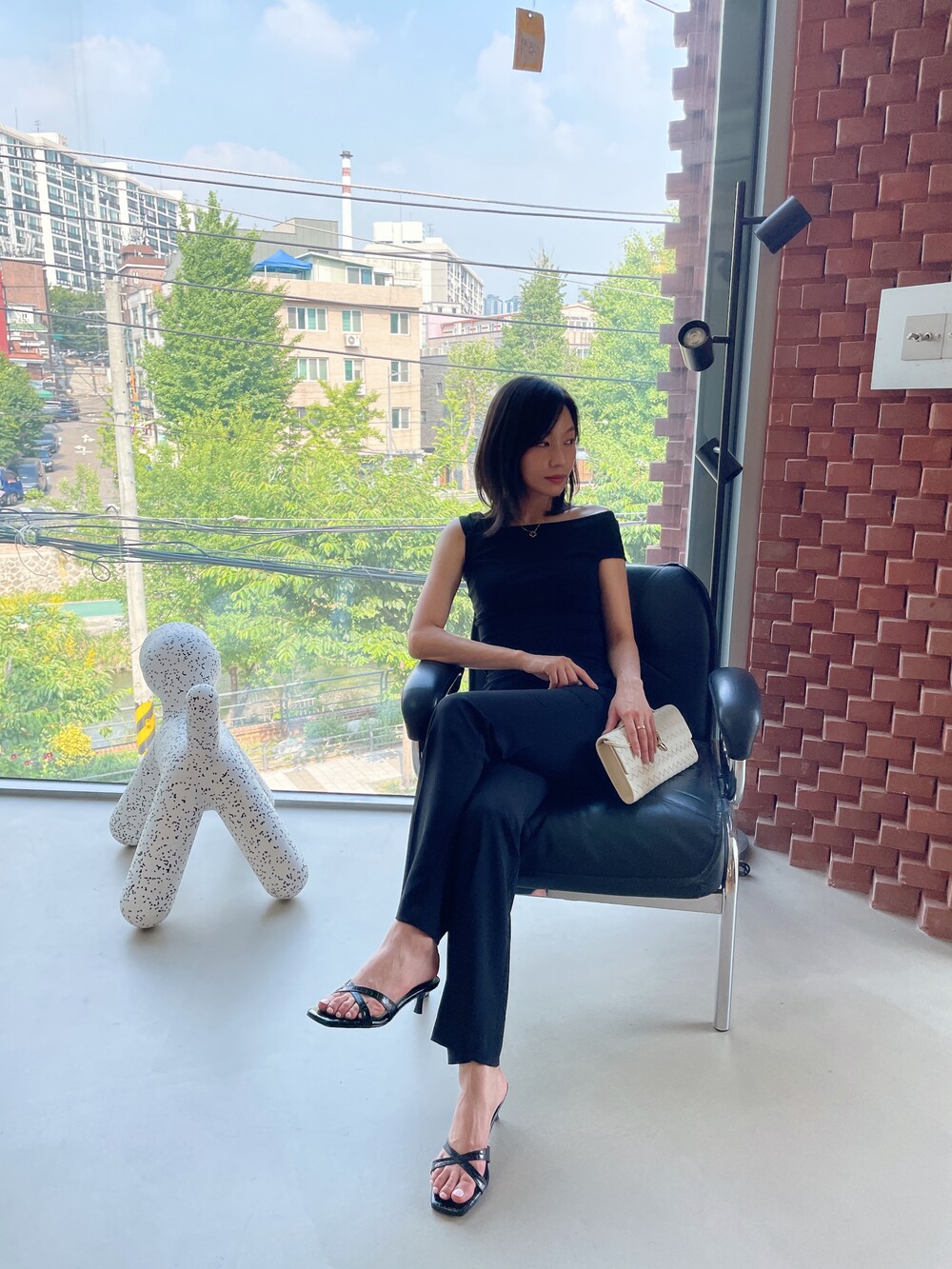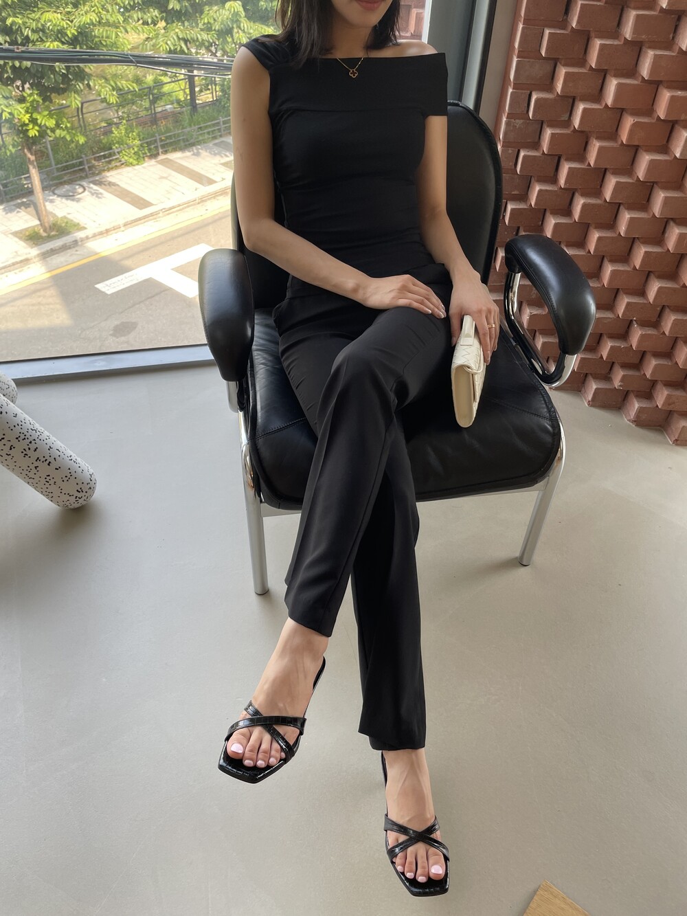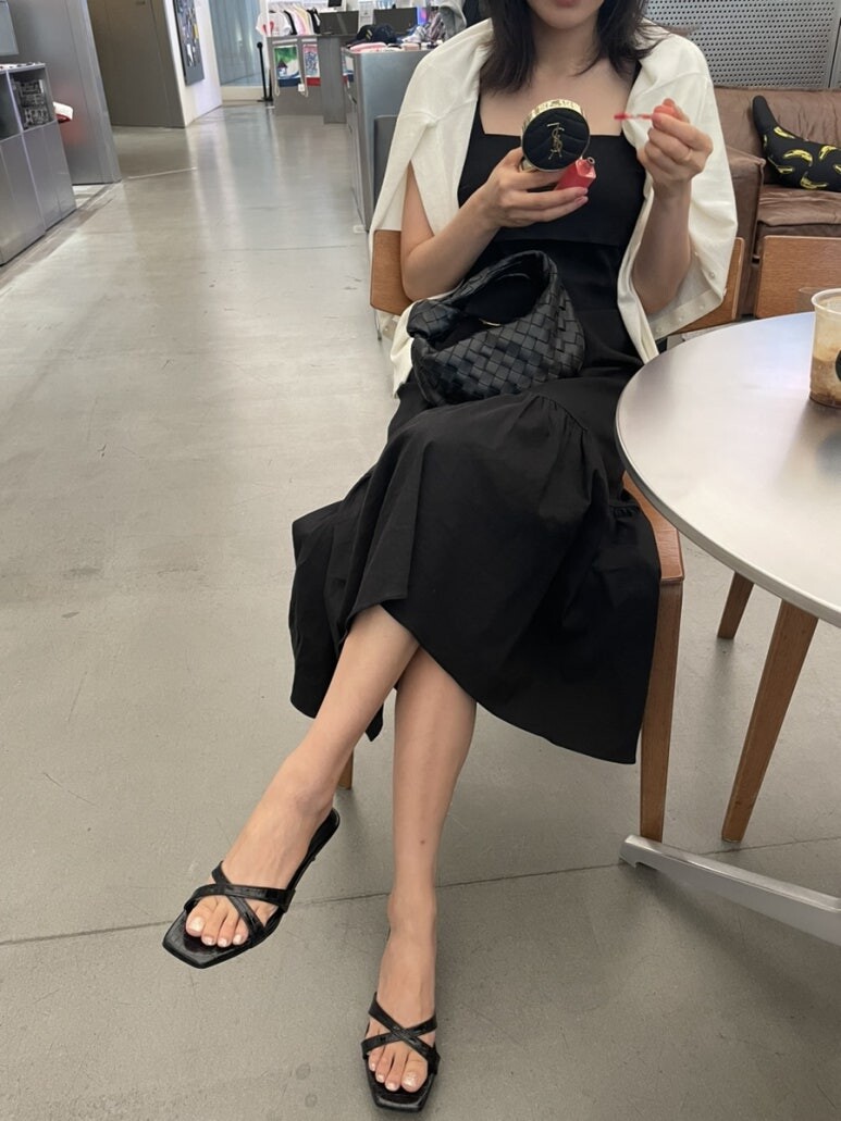 낮은 굽임에도 룩에 시크한 포인트를 주는 샌들로
