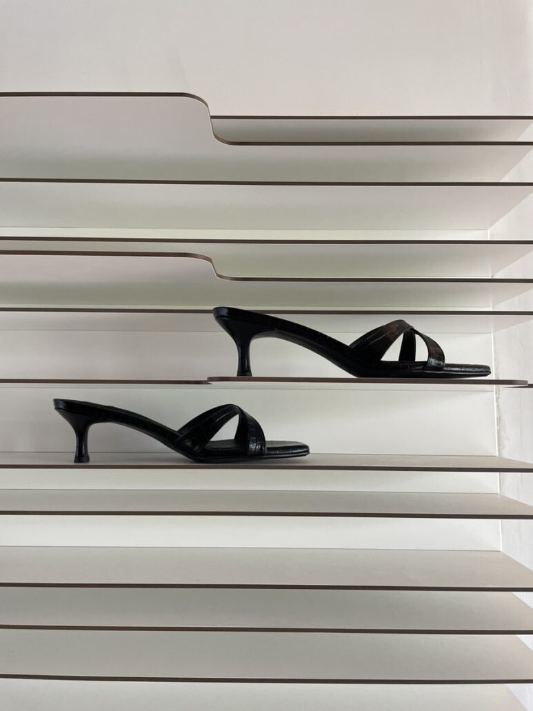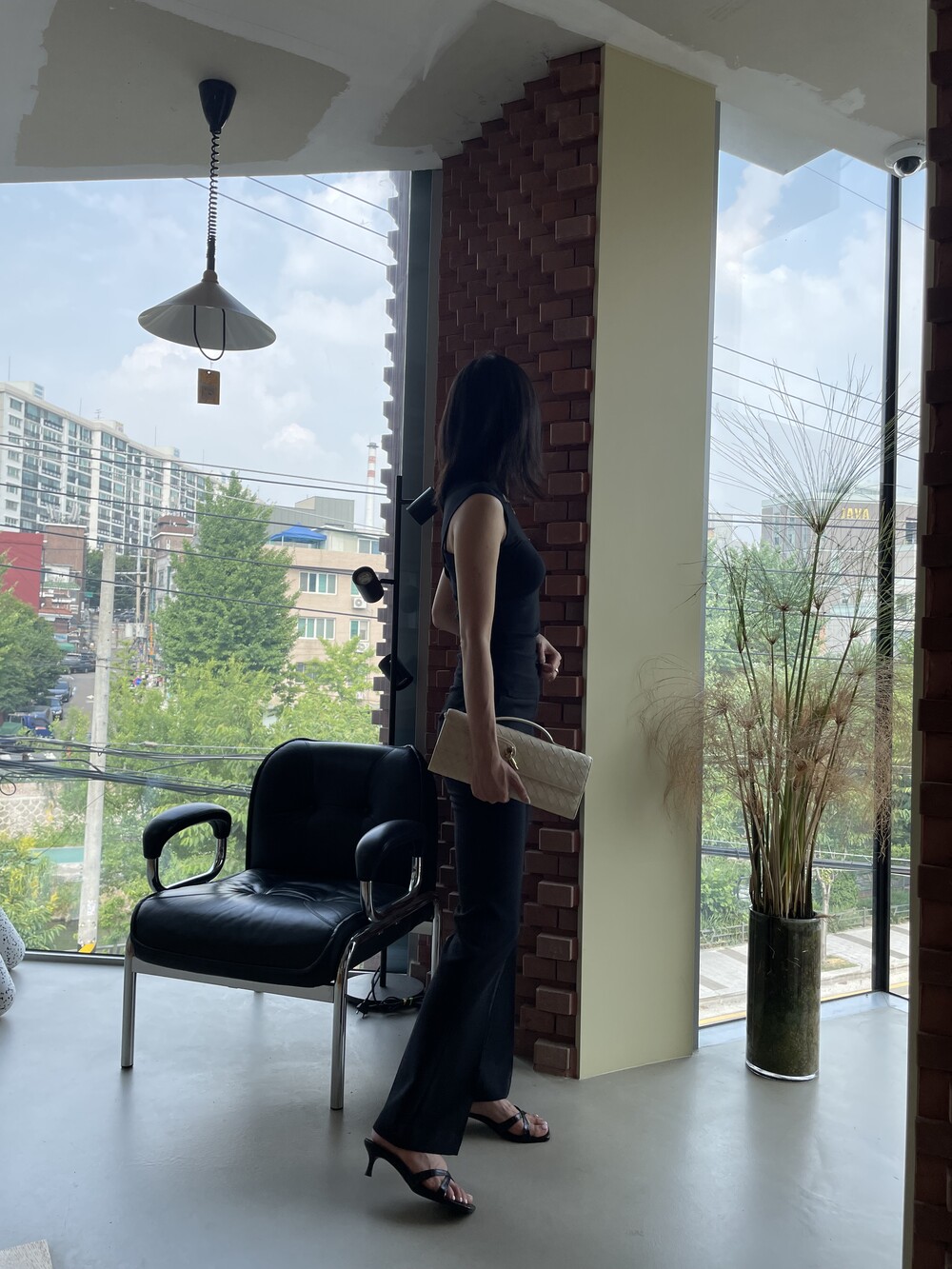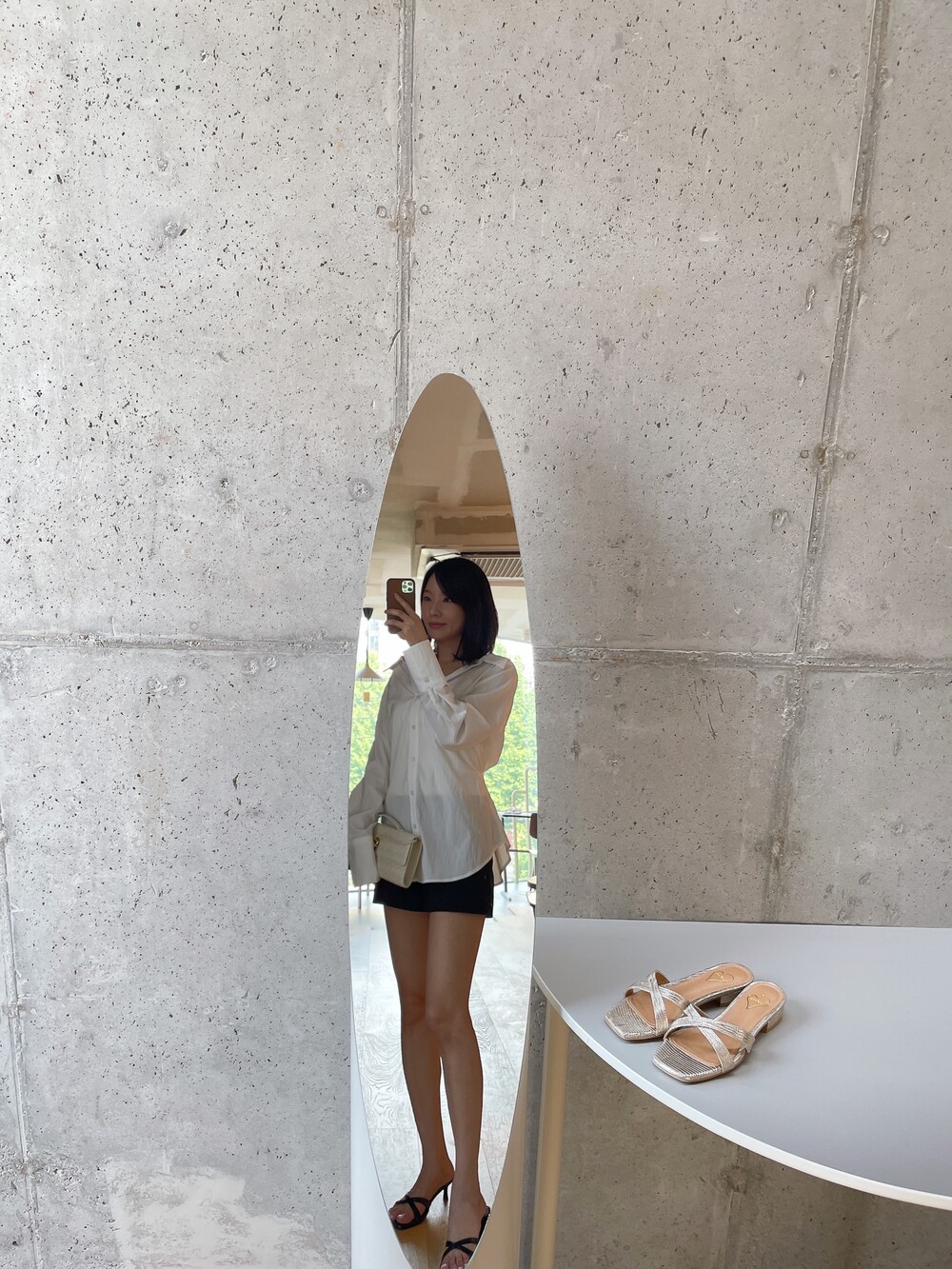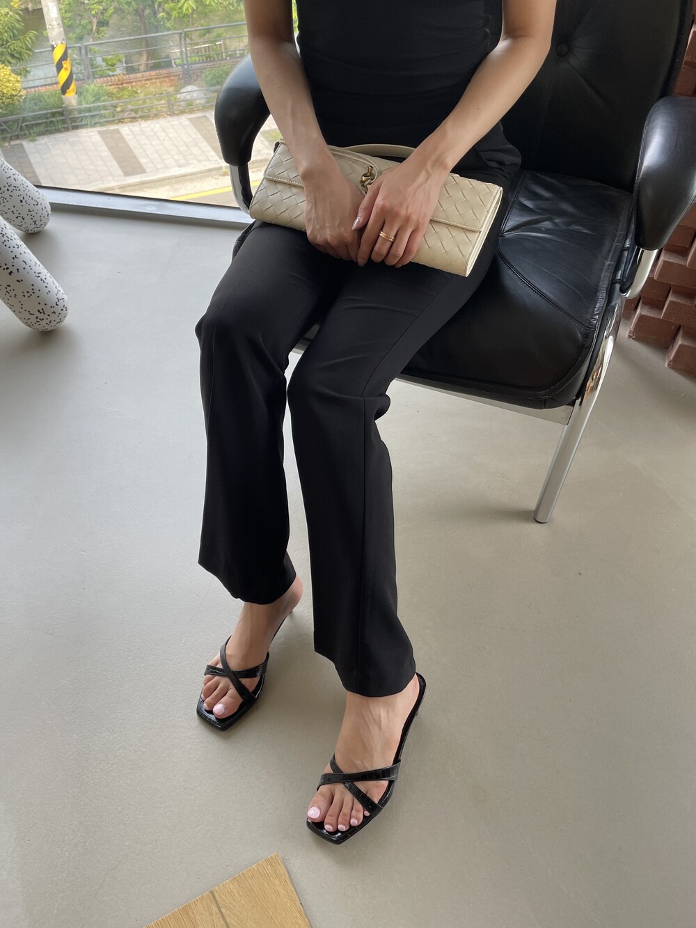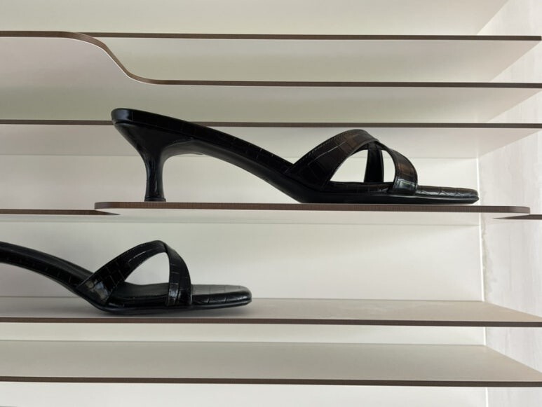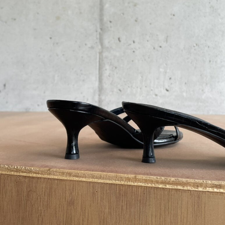 낮은 굽임에도 룩에 시크한 포인트를 주는 샌들로