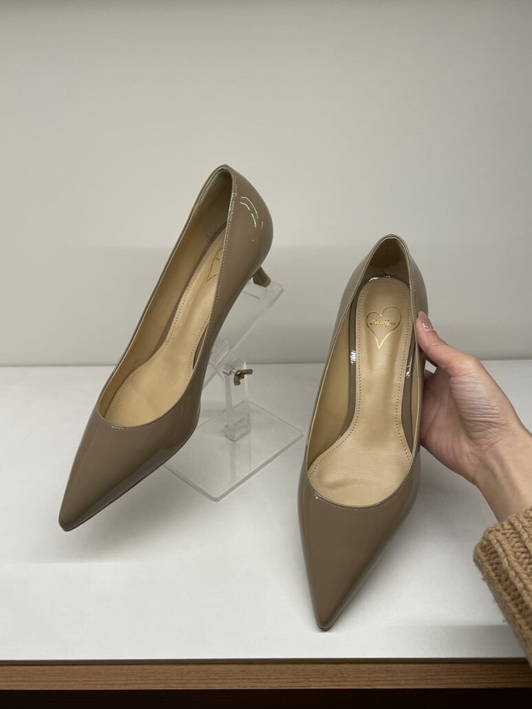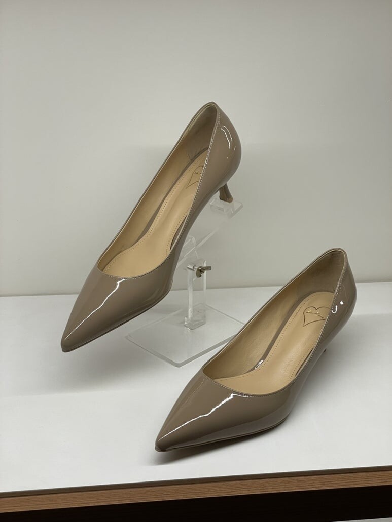 부드러운 베이지 톤의 페이턴트 레더 펌프스입니다.