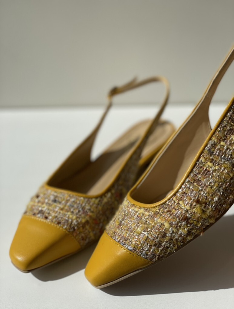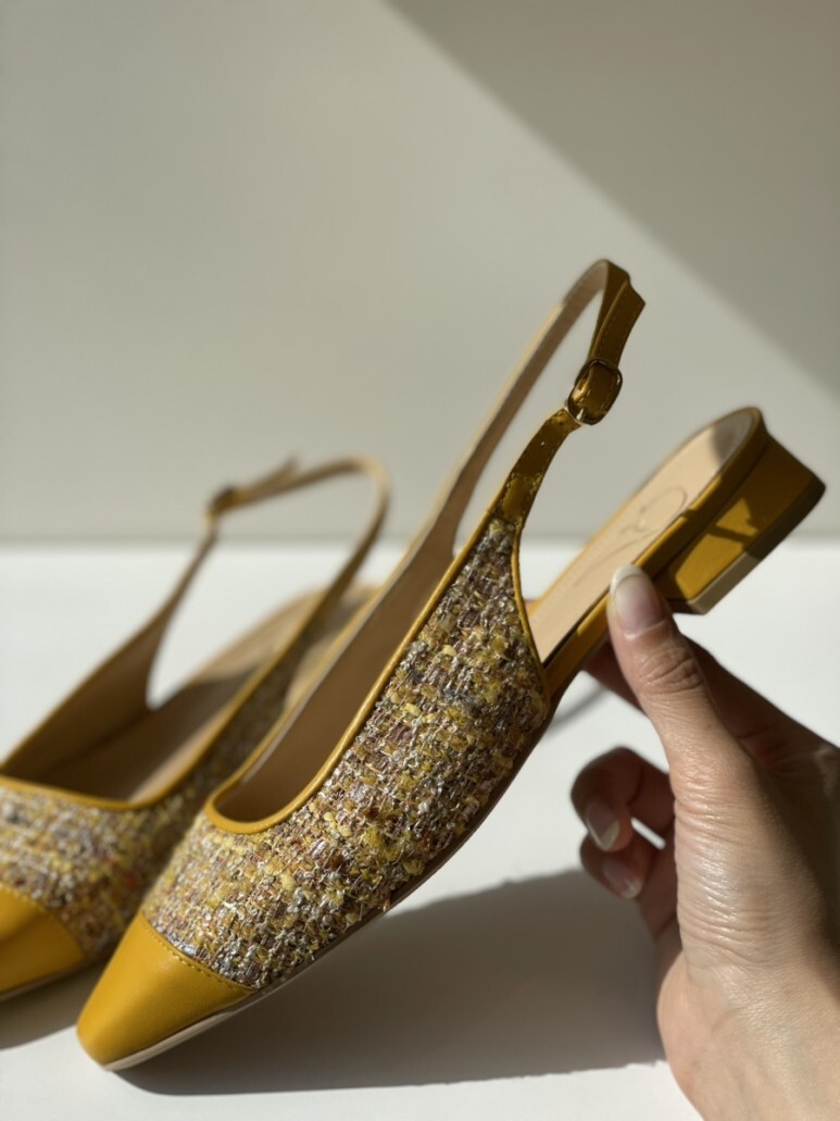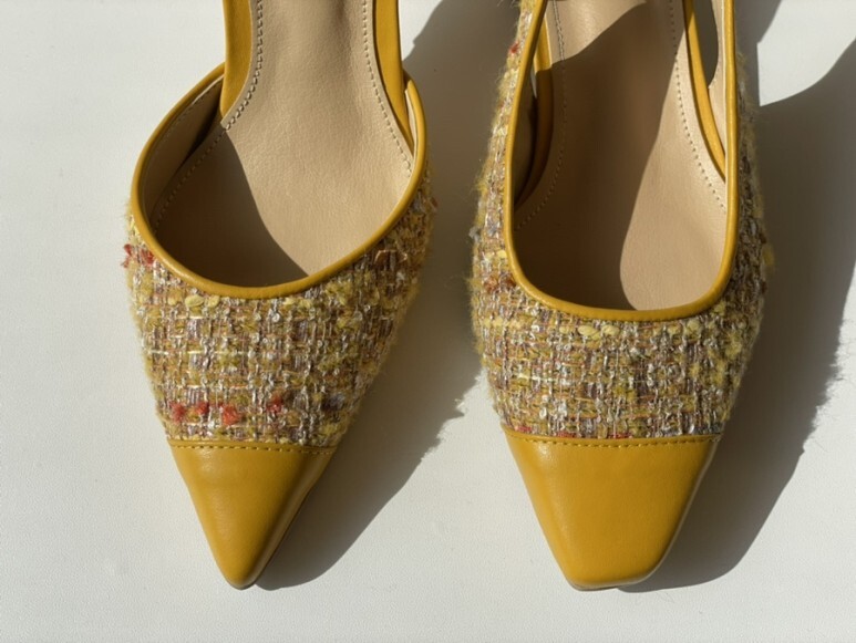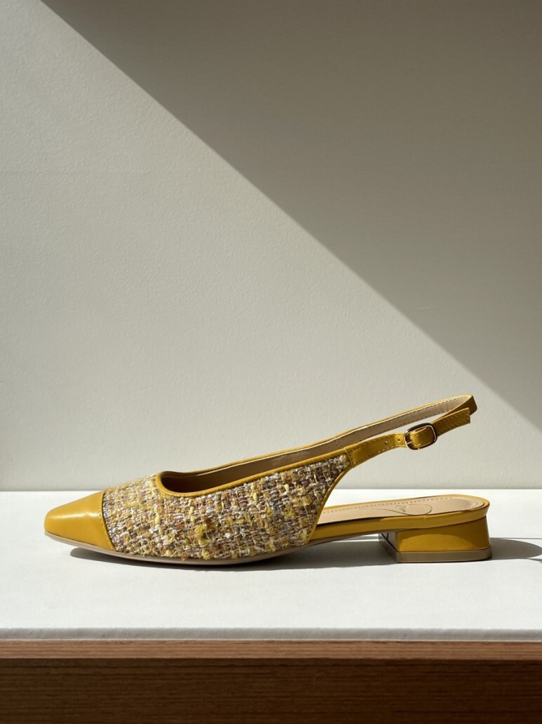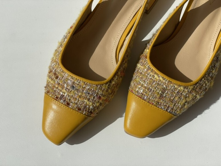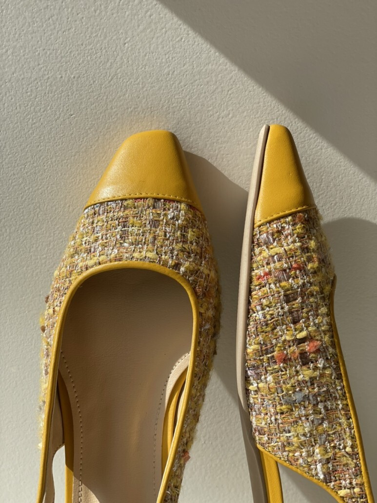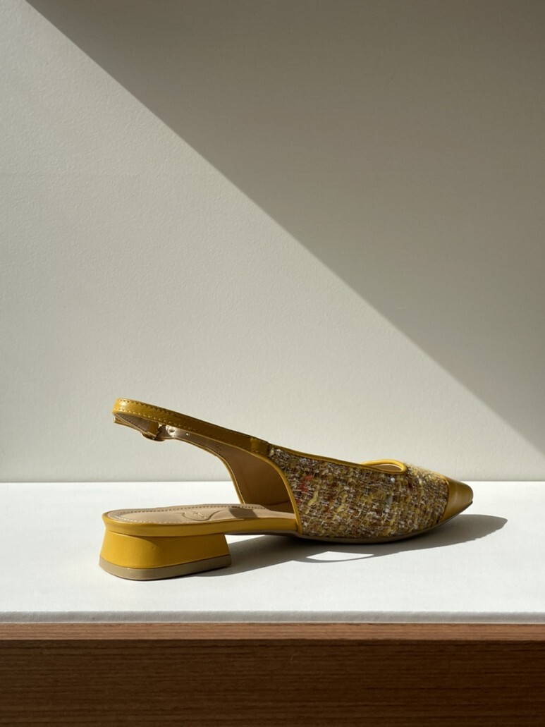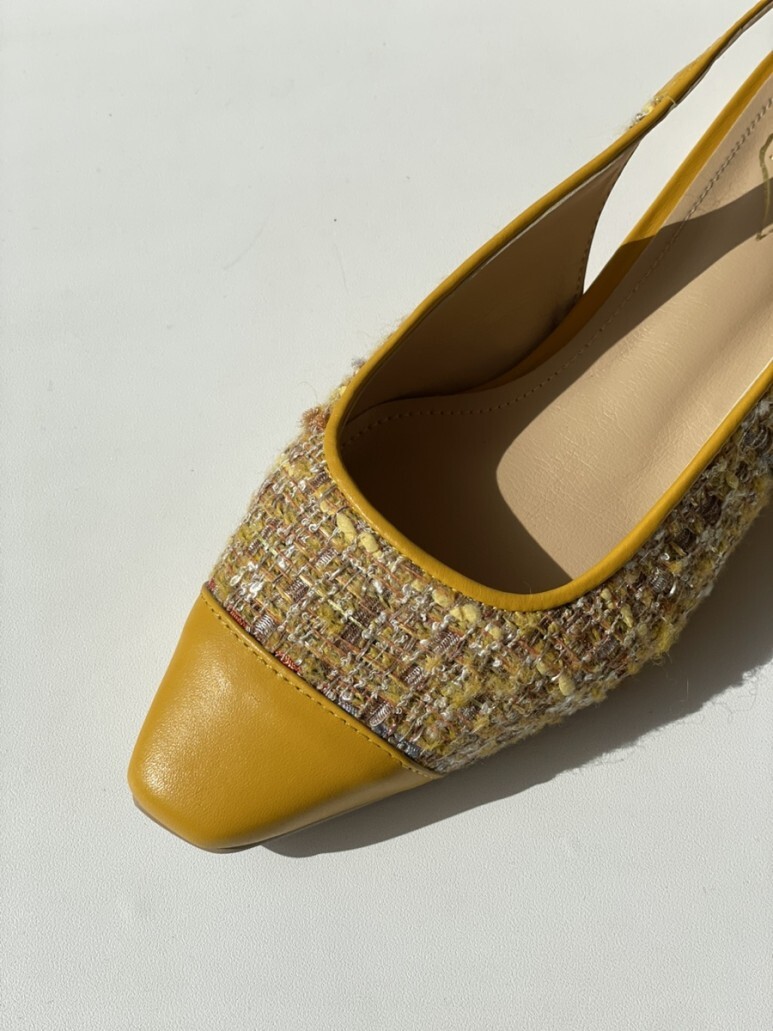특히 정제된 옐로우 가죽과 트위드의 텍스처 대비가