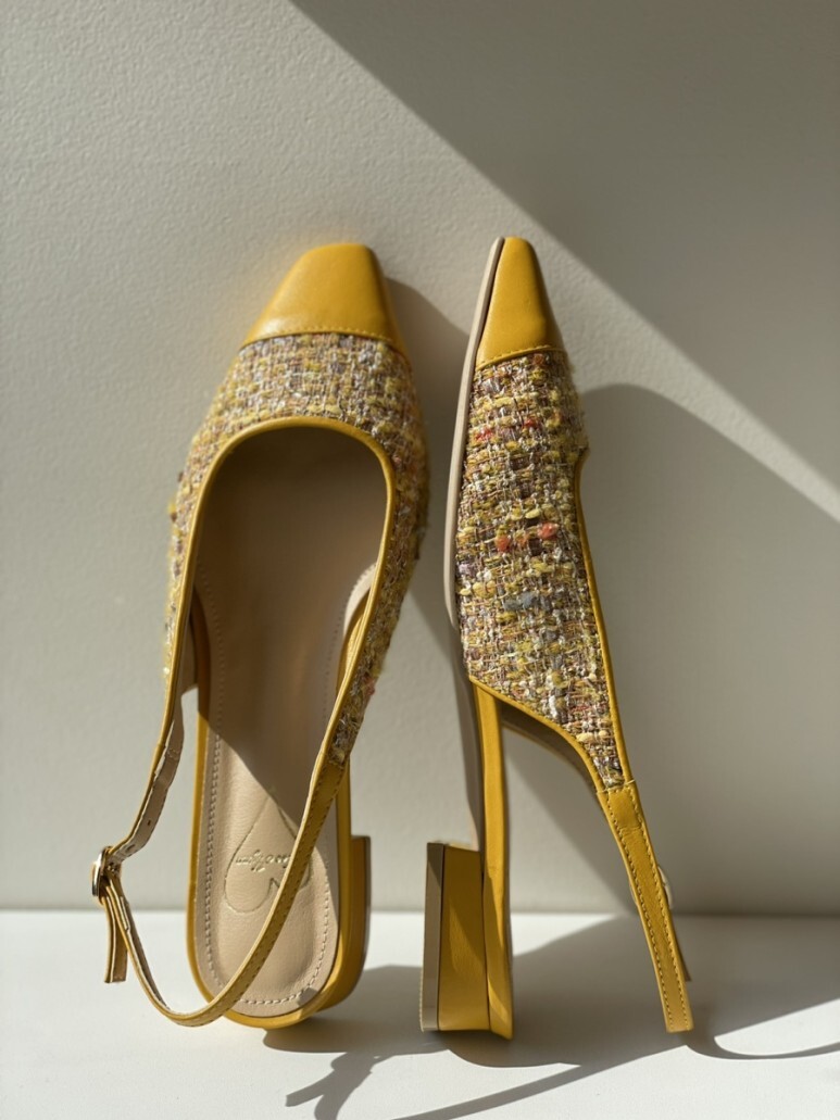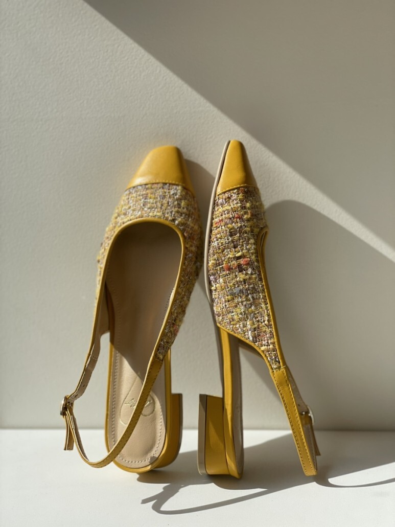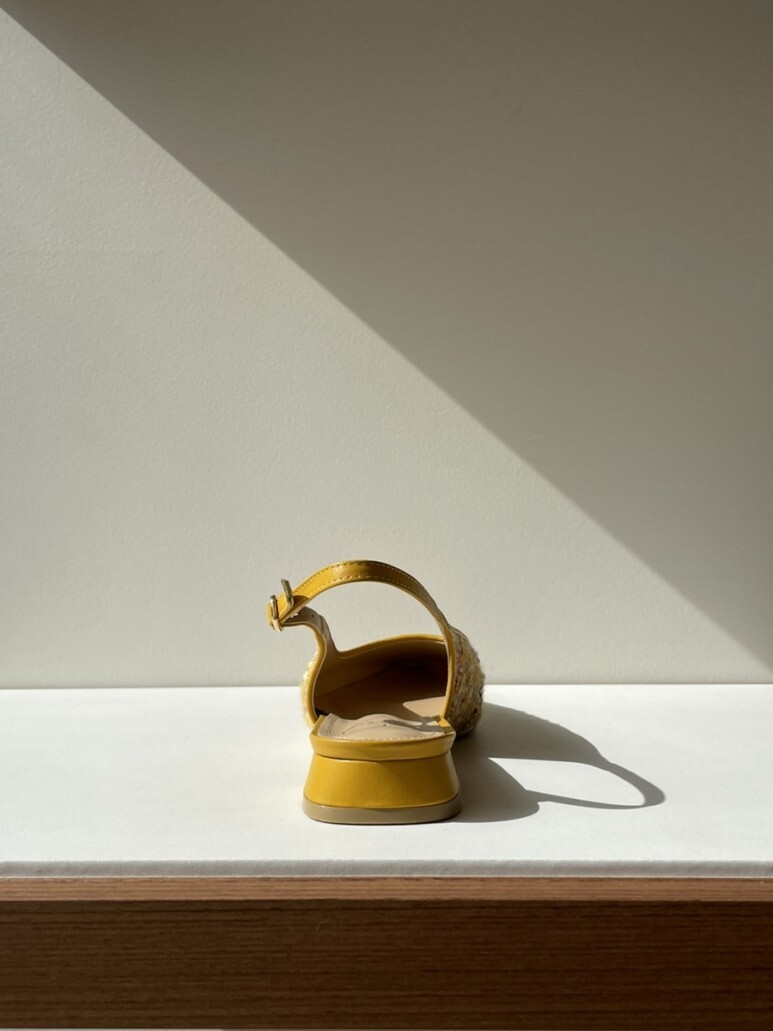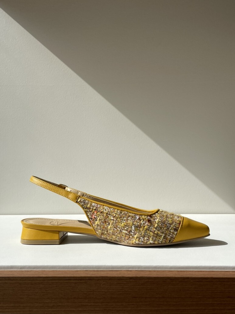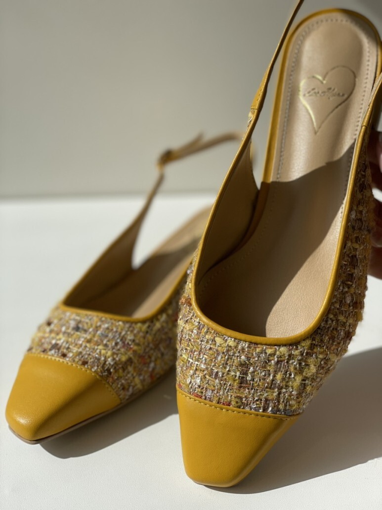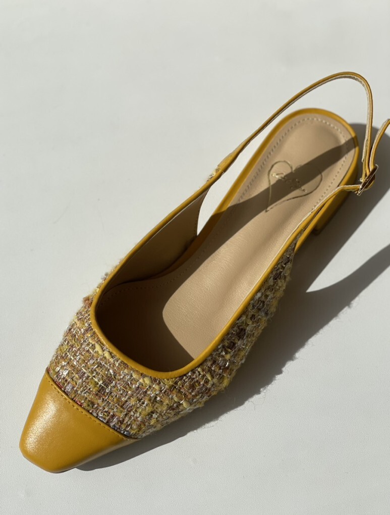 특히 정제된 옐로우 가죽과 트위드의 텍스처 대비가