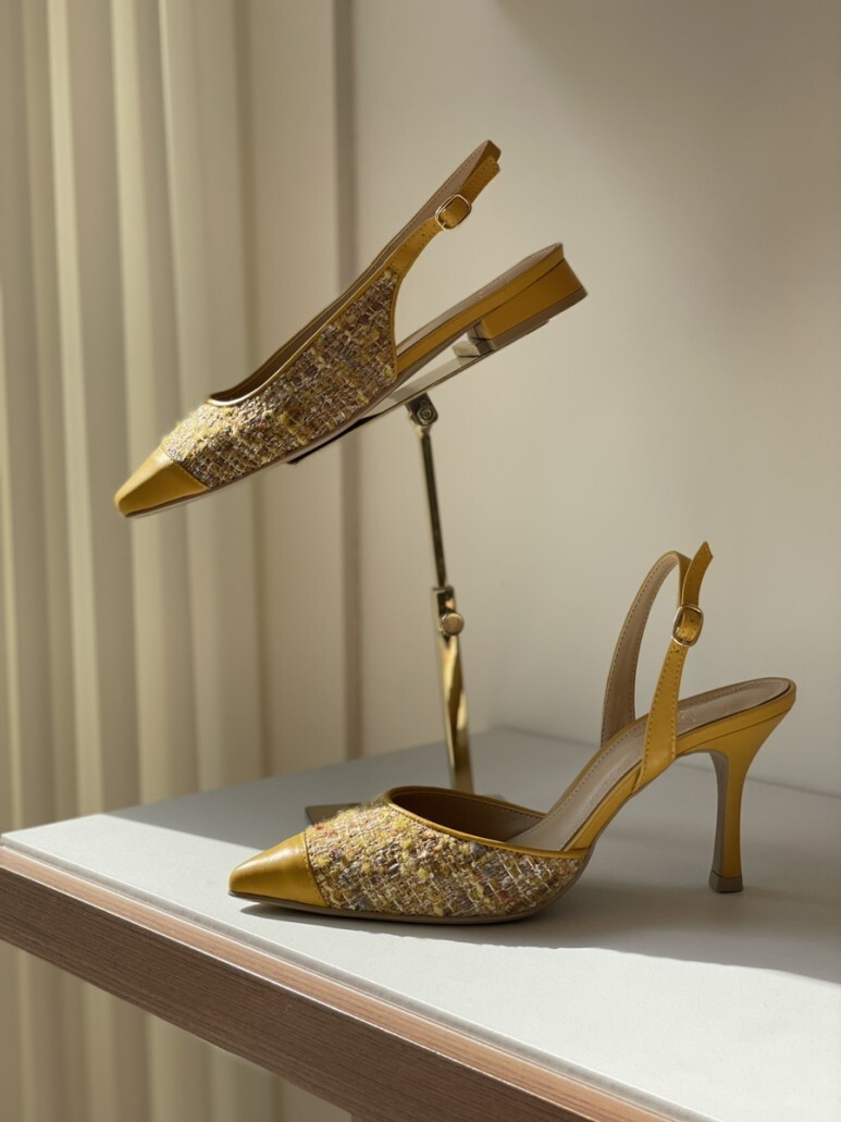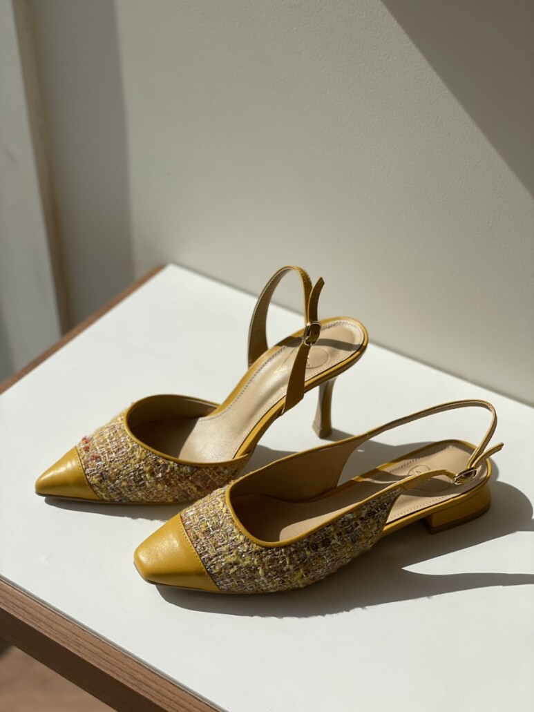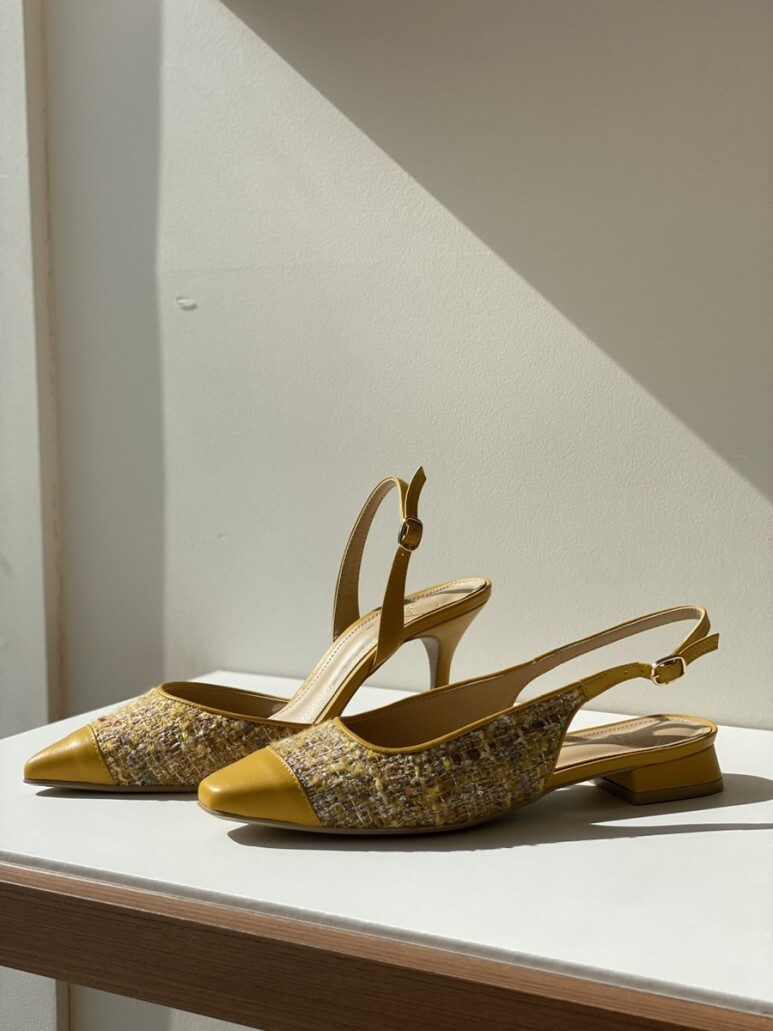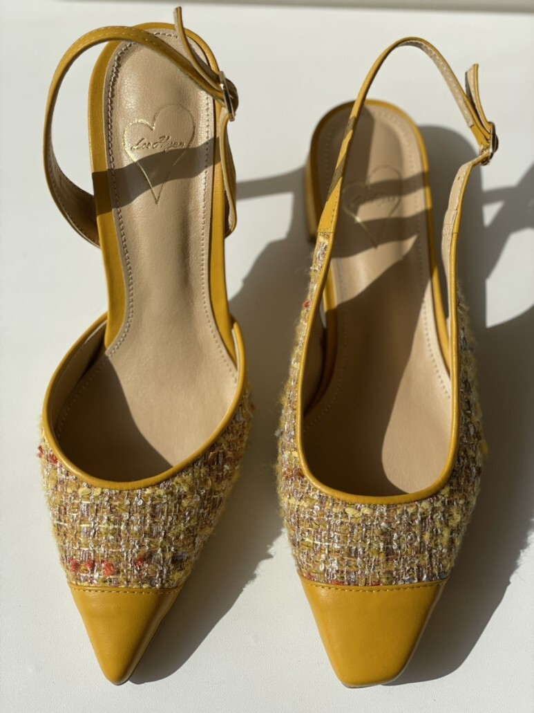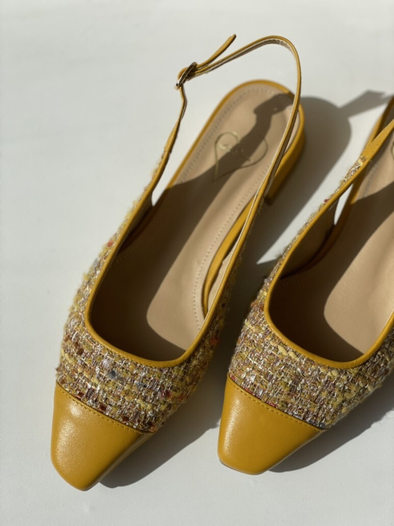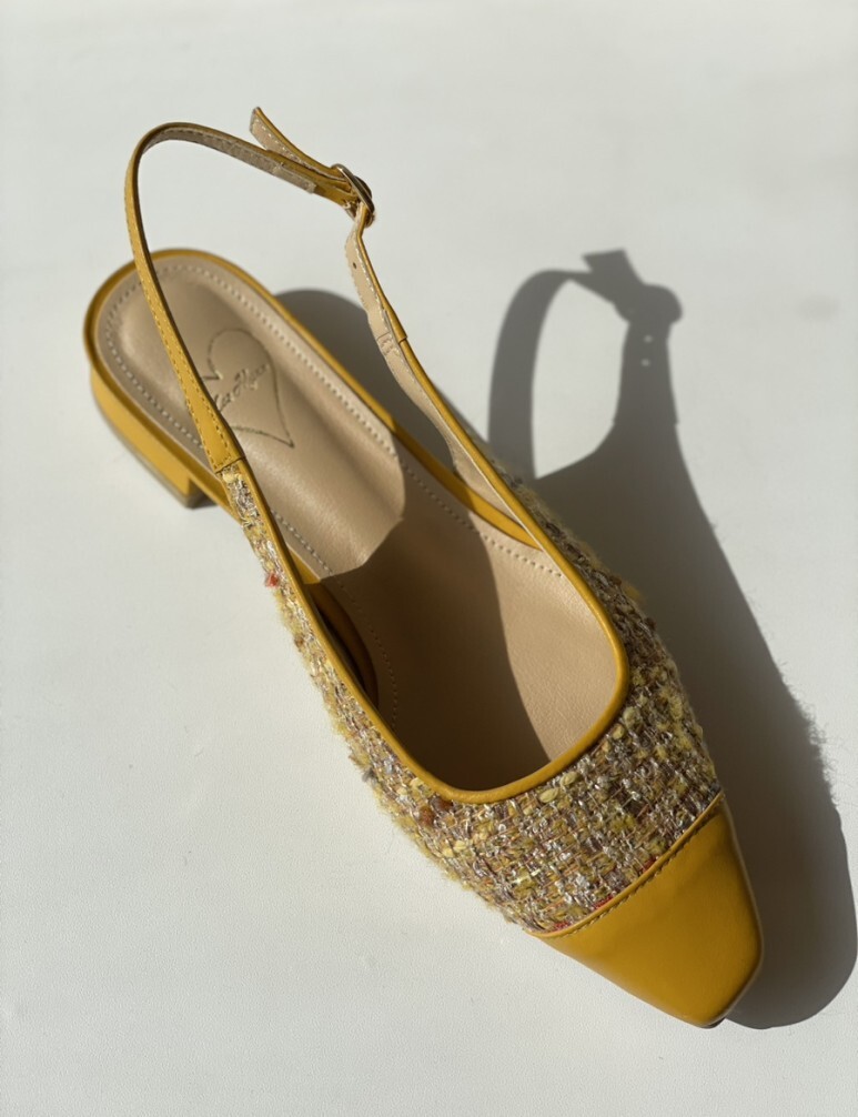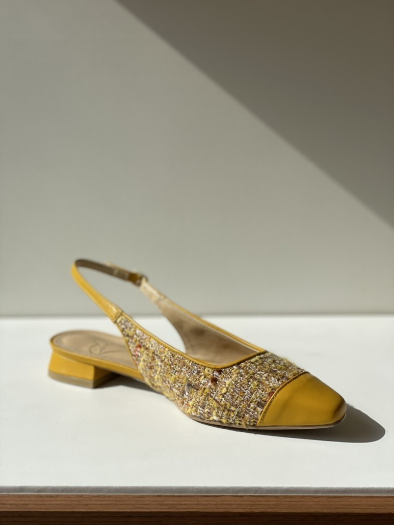 특히 정제된 옐로우 가죽과 트위드의 텍스처 대비가